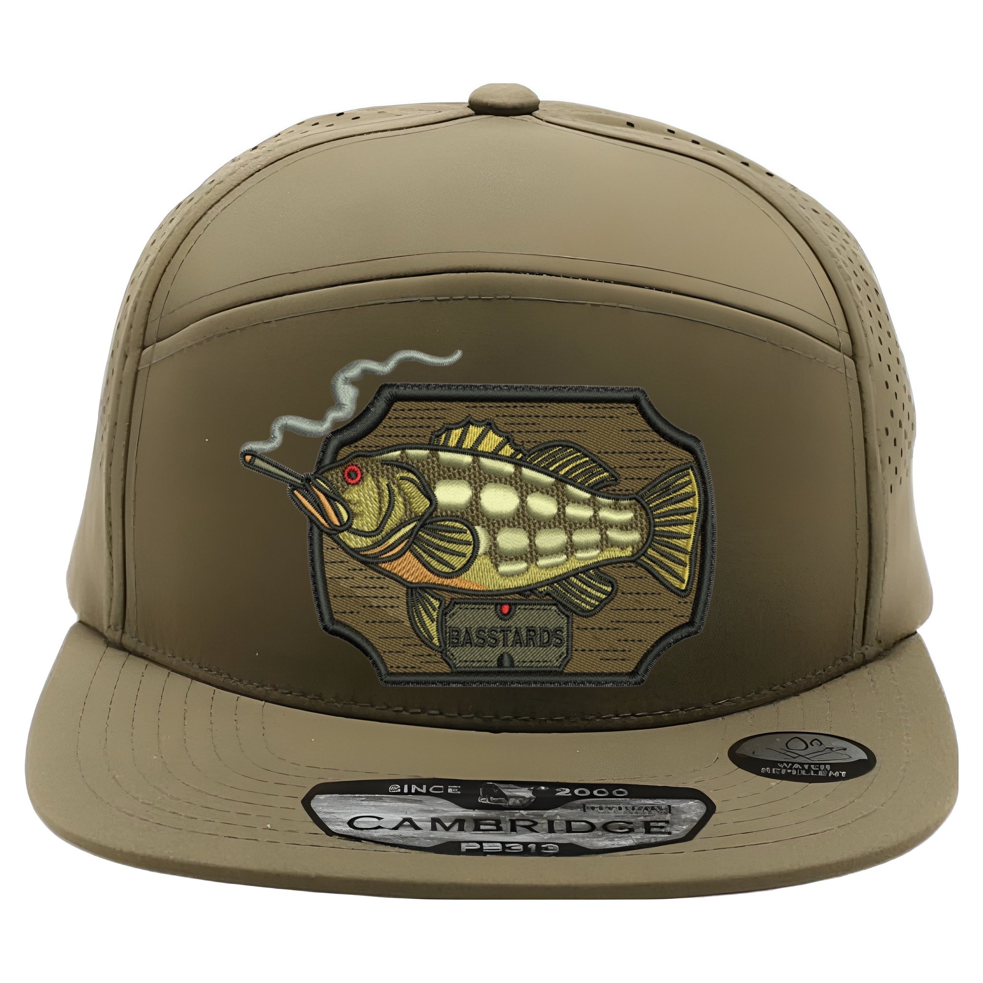 Our classic “BAD MOUTH BASSTARD” design embroidered on a 5 panel SnapBack hat in Olive.